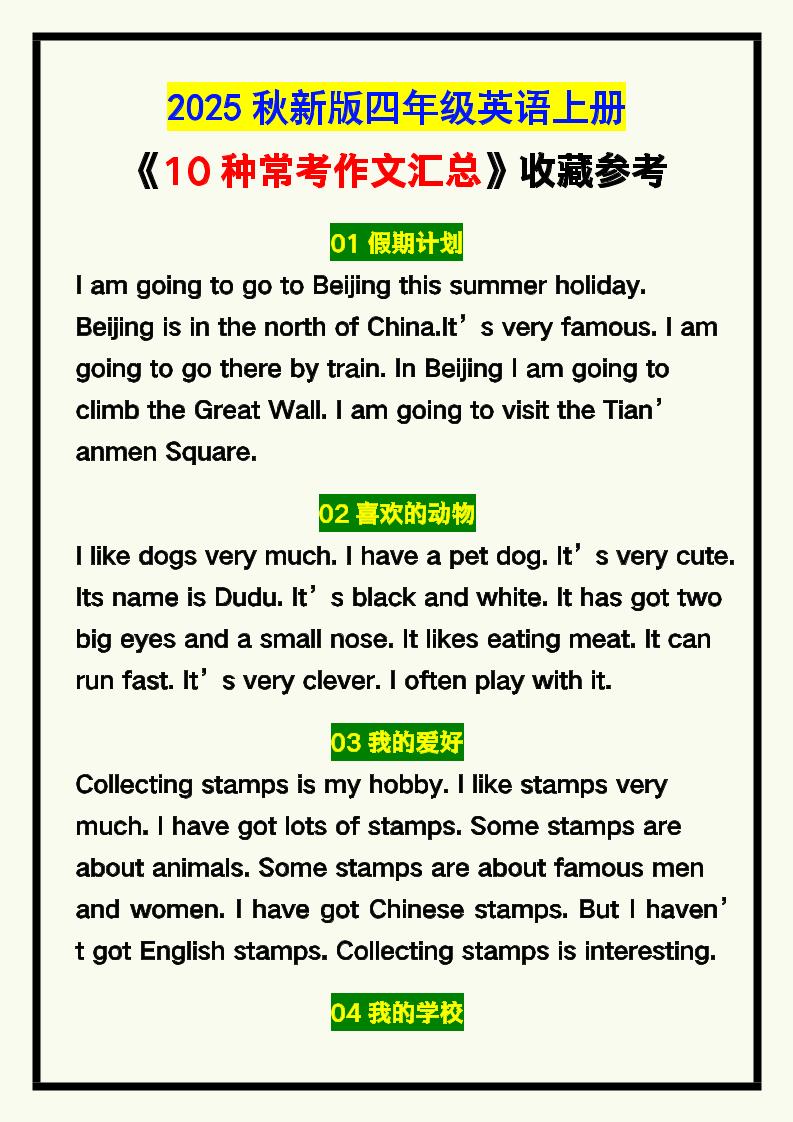 【2025秋新版】四年级英语上册《10种常考作文汇总》,收藏参考!