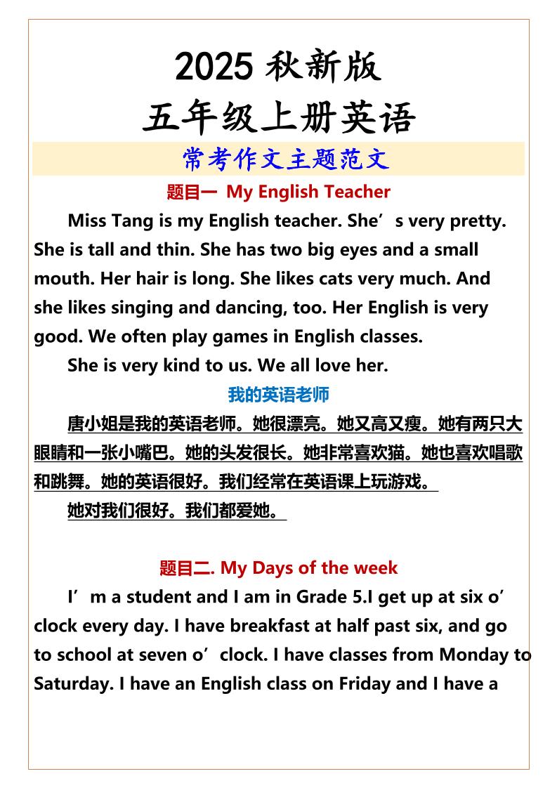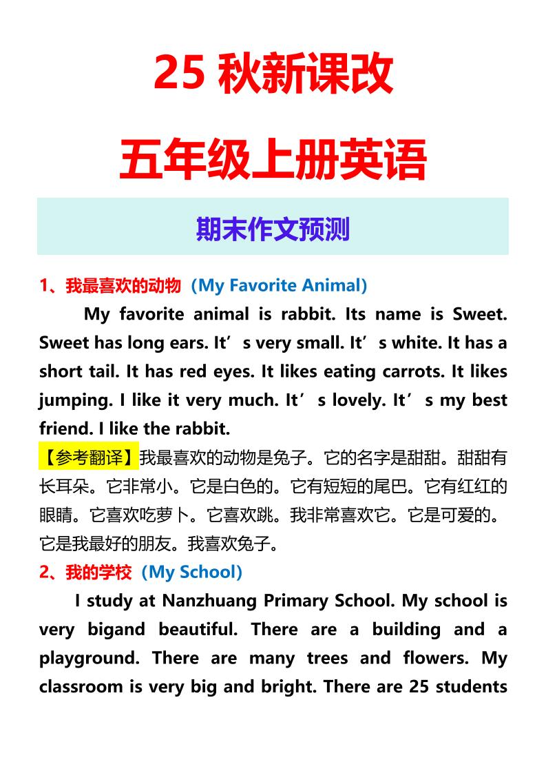 【2025秋新版】五年级必考英语作文范文-五上英语