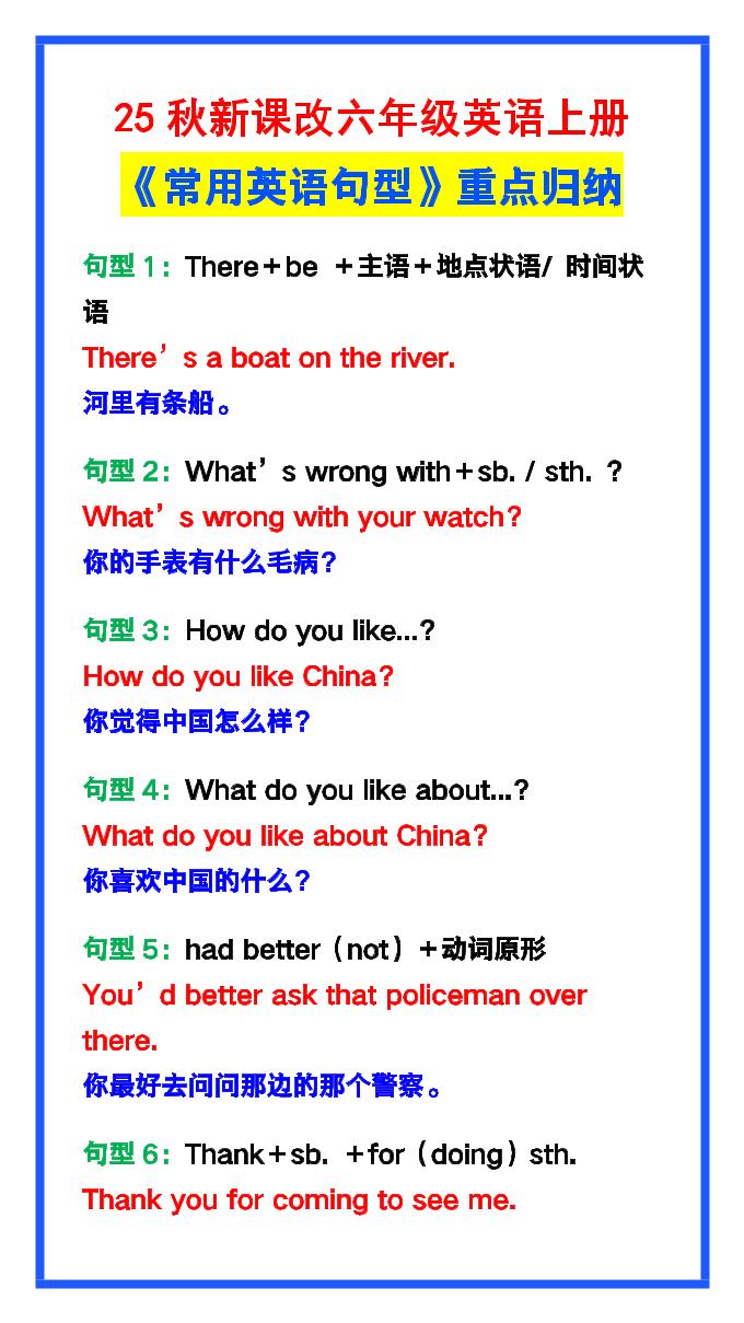 【2025秋新版】六年级英语上册《常考句子句型》汇总,学习巩固必备!