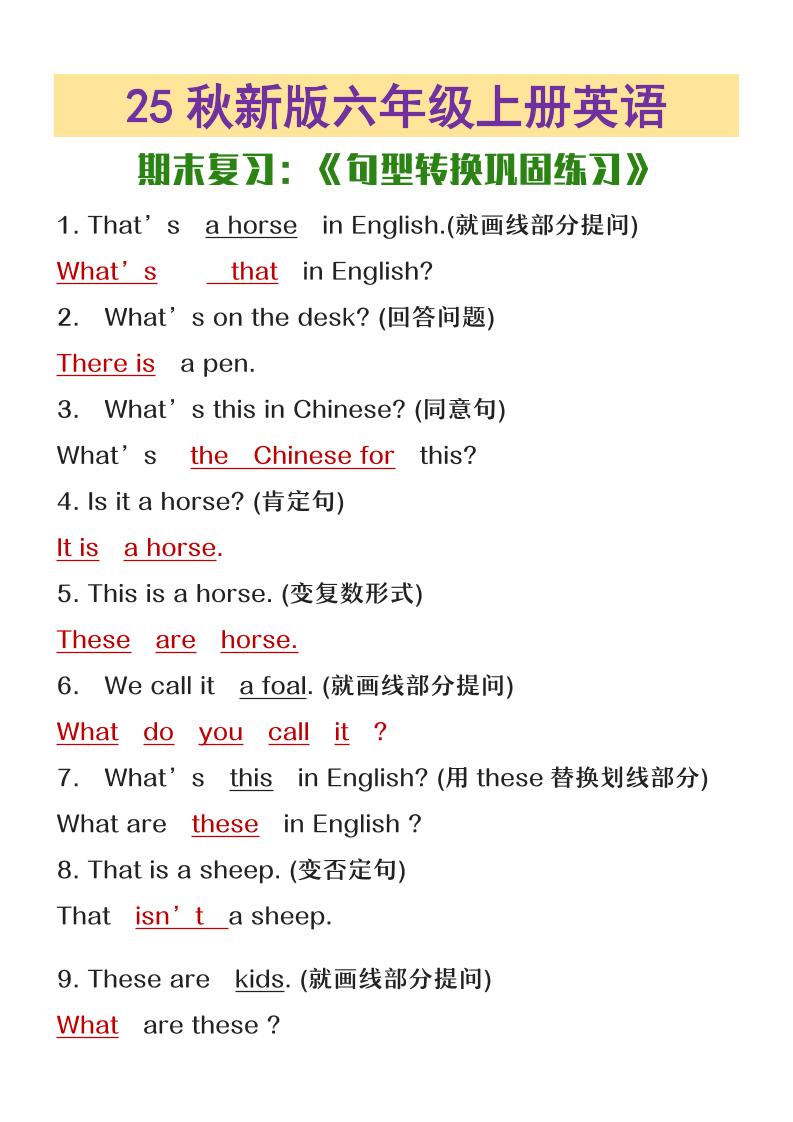 【2025秋新版】六年级上册英语期末复习句型转换巩固练习