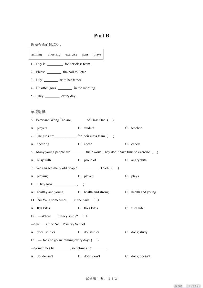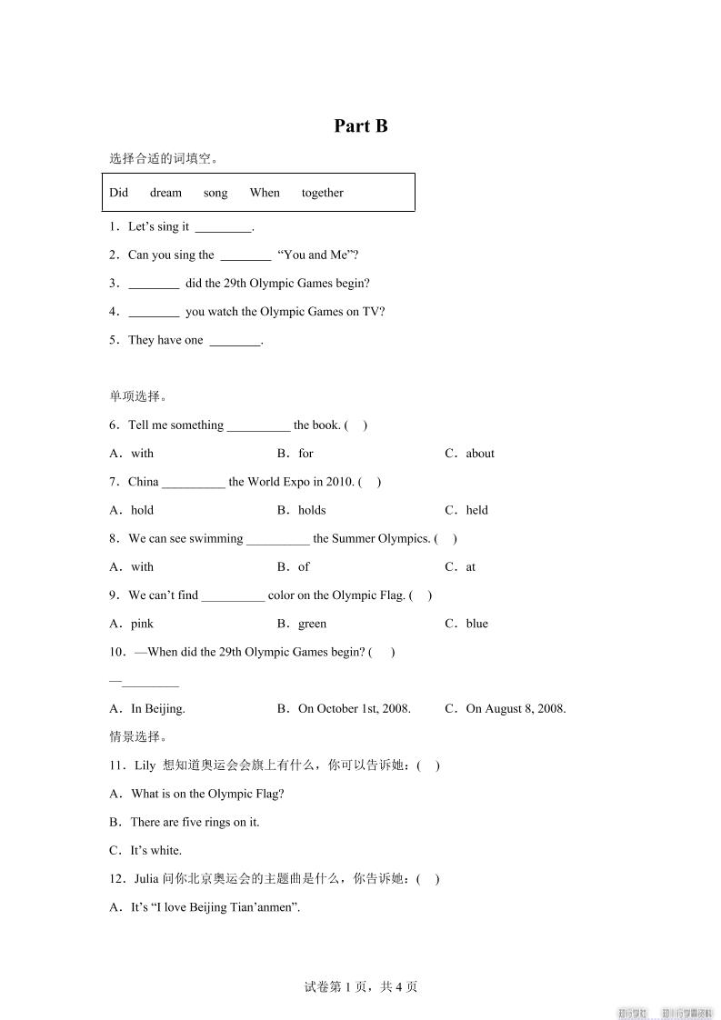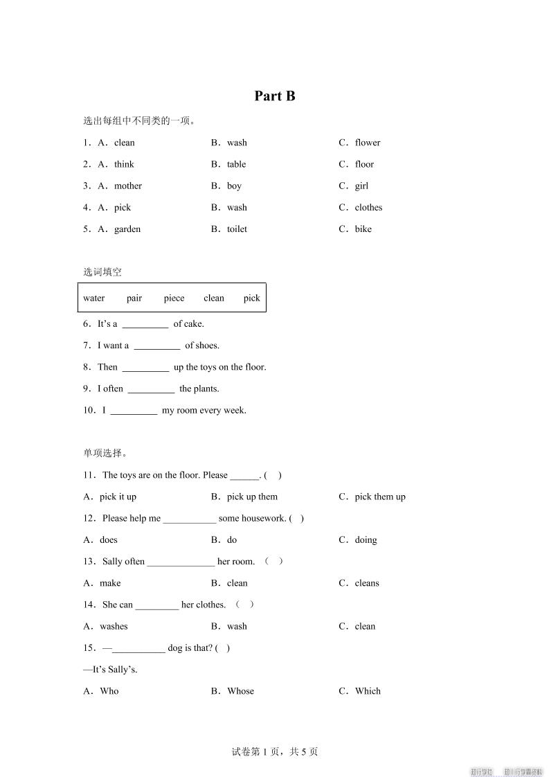 闽教版英语六年级上册Unit5PartB练习卷