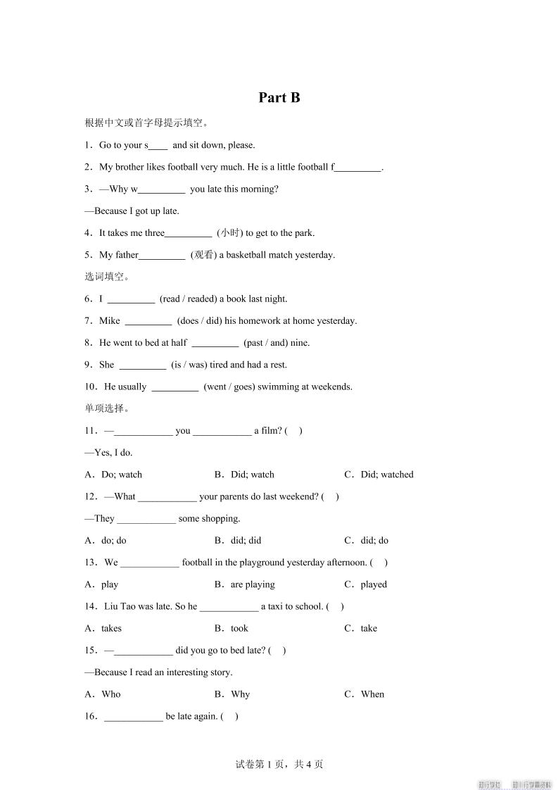 闽教版英语六年级上册Unit1PartB练习卷