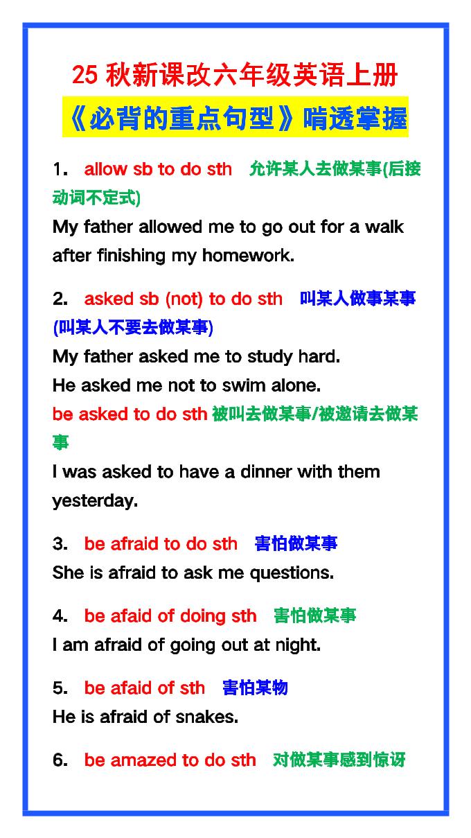 【2025秋新版】六年级英语上册《必背的重点句型》啃透掌握,不怕考试!