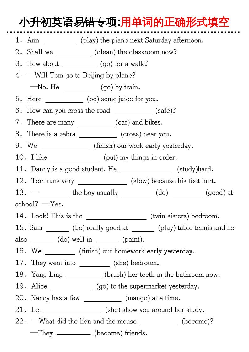 《小升初英语易错专项特训:用单词的正确形式填空》