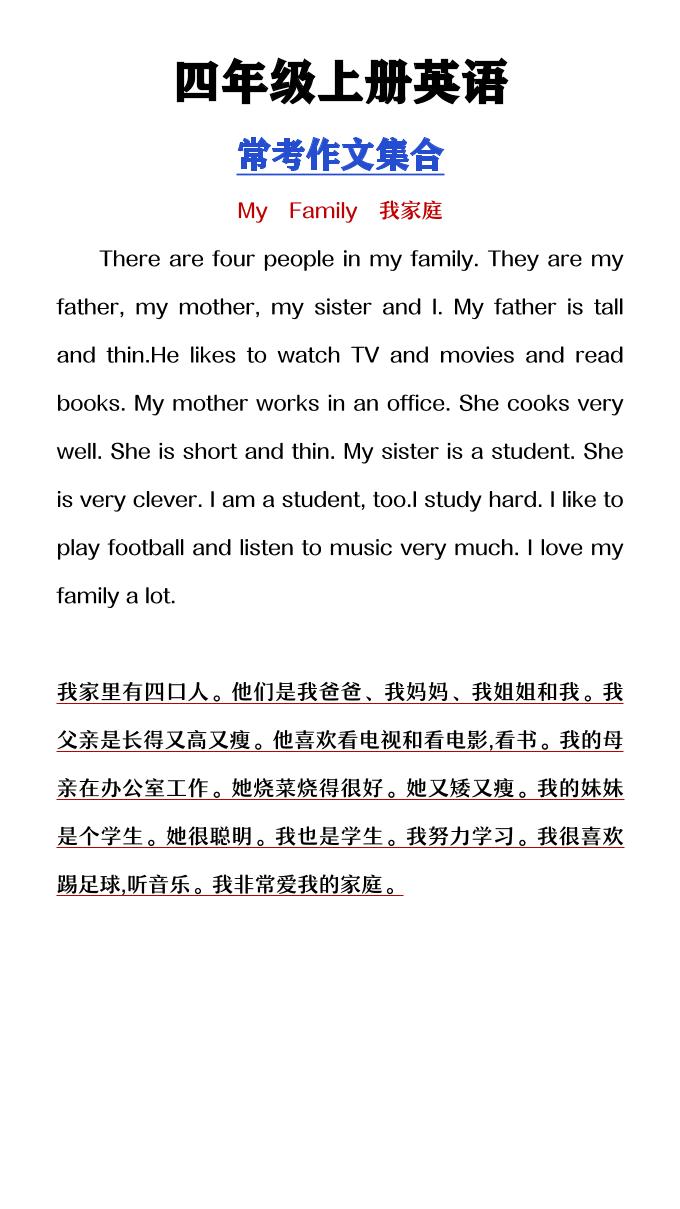 首页 > 全部 > 四年级 > 【2025秋新版】四年级上册英语常考作文合集