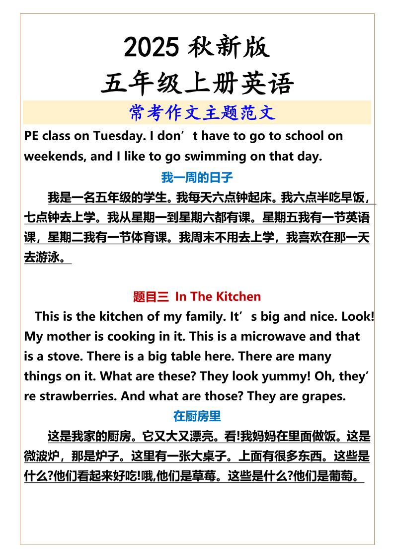 【2025秋新版】五年级上册英语常考作文主题范文