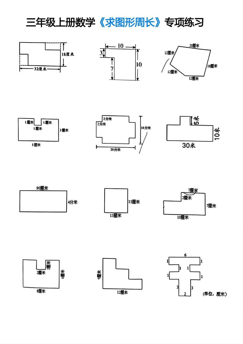 首页 > 全部 > 三年级 > 三年级上册数学求图形周长专项练习