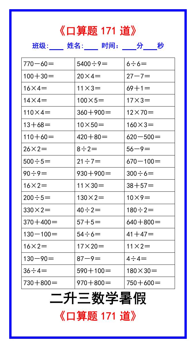 二升三数学暑假《口算练习题171道》汇总-三上数学