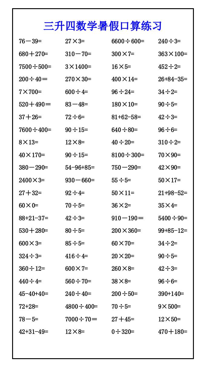 三升四数学暑假口算练习-四上数学